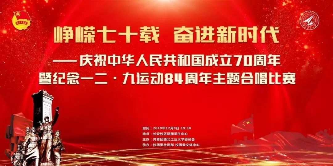 12月8日晚,由共青团西北工业大学委员会主办,校团委社团部、校团委文体中心承办的“峥嵘七十载 奋进新时代”,庆祝中华人民共和国成立70周年暨纪念一二九运动84周年主题爱国歌曲合唱比赛在西北工业大学长安校区翱翔学生中心隆重举行。