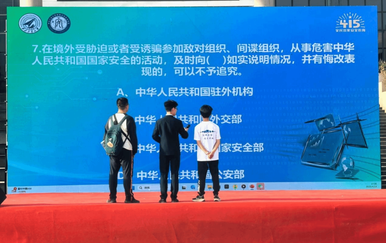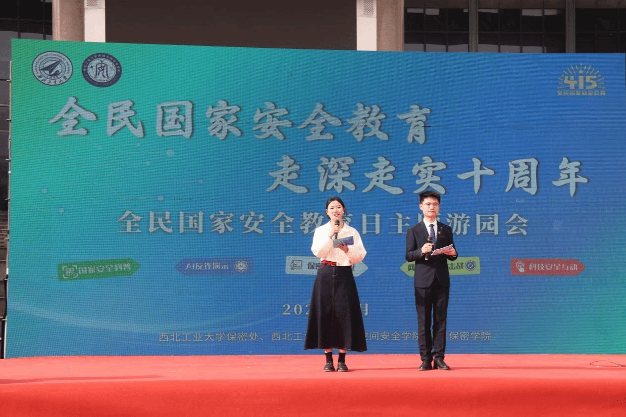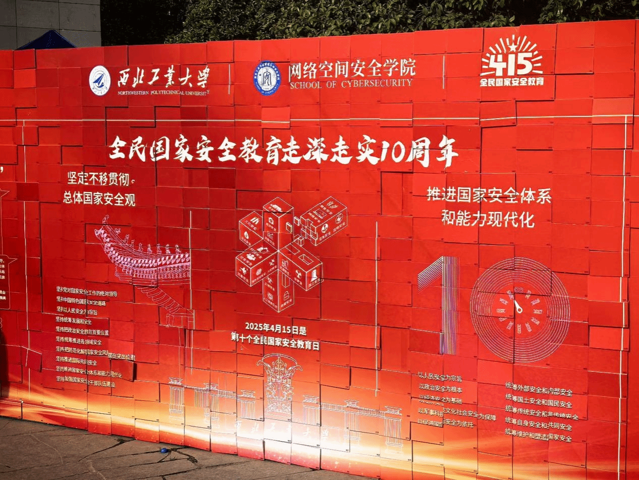 活动现场周围还布置有“全民国家安全教育 走深走实十周年”——“4·15”全民国家安全教育日主题展,内容涵盖总书记关于总体国家安全观的重要论述、国家安全基本知识及相关法律体系、案例警示、国家安全西工大在行动等。推筒子