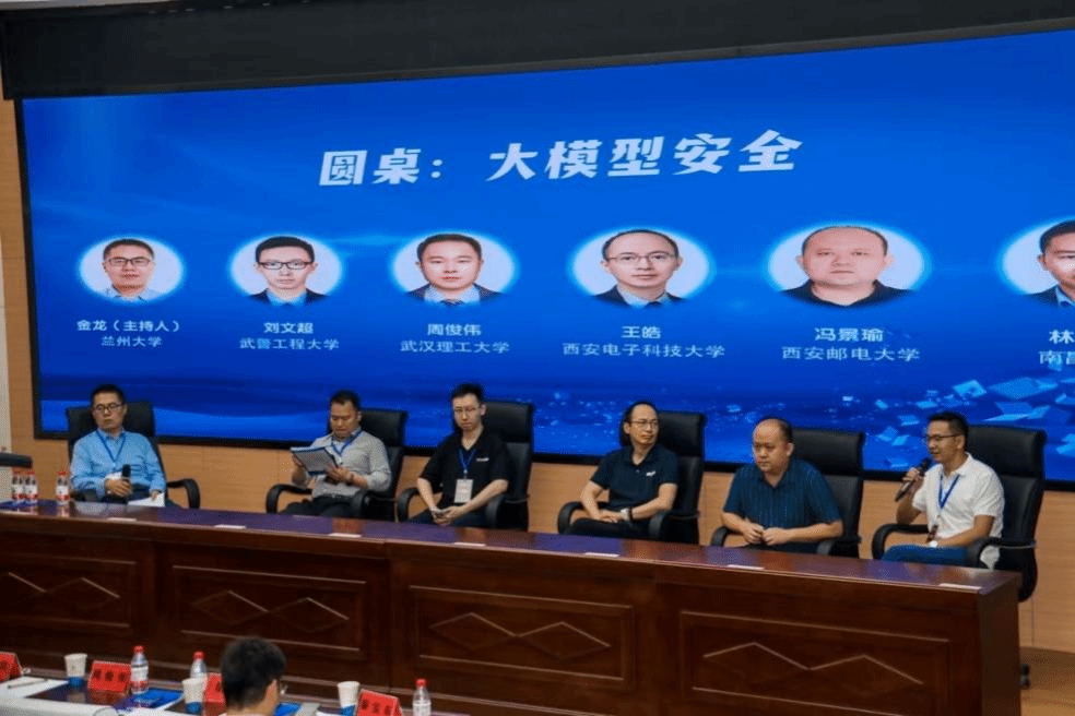 大模型安全圆桌讨论由兰州大学金龙教授主持。武汉理工大学教授周俊伟、西安电子科技大学教授王皓、西安邮电大学教授冯景瑜、南昌大学副教授林德钰、武警工程大学博士刘文超围绕数据泄露风险、隐私保护挑战、大模型幻觉及其安全检测等关键议题展开深入讨论,提出应加快推进新型安全防御机制与技术标准建立,构建科学完善的评估体系,提升大模型安全防护能力。
