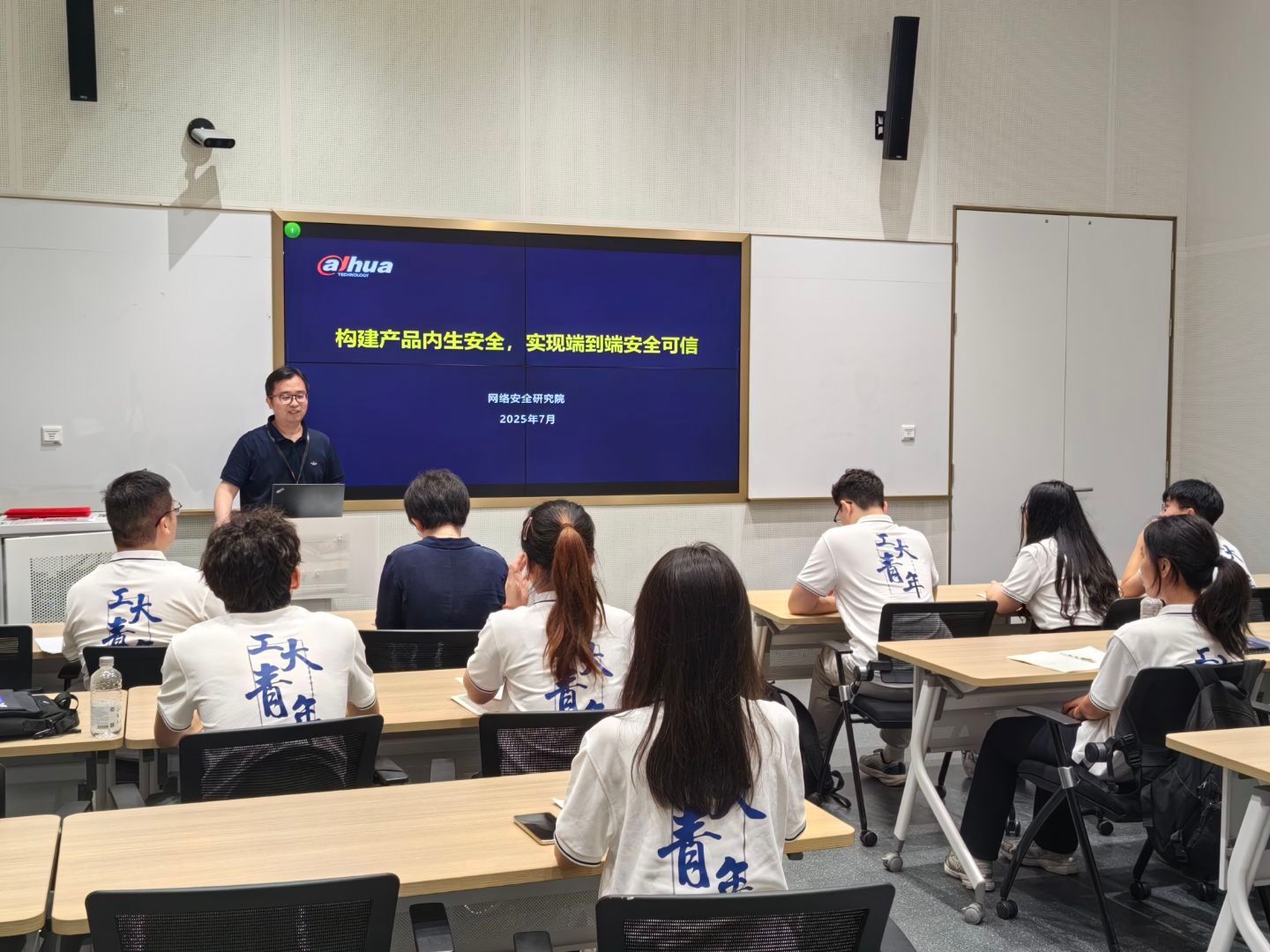 7月8日,实践队走进大华股份,公司招聘经理丁迪系统介绍了公司的战略布局、推筒子及校招岗位需求,并强调期待与高校深度合作,共同培养网络安全人才。网络空间安全首席科学家张剑青以《构建产品内生安全,实现端到端安全可信》为主题,为实践队员进行了前沿技术分享。