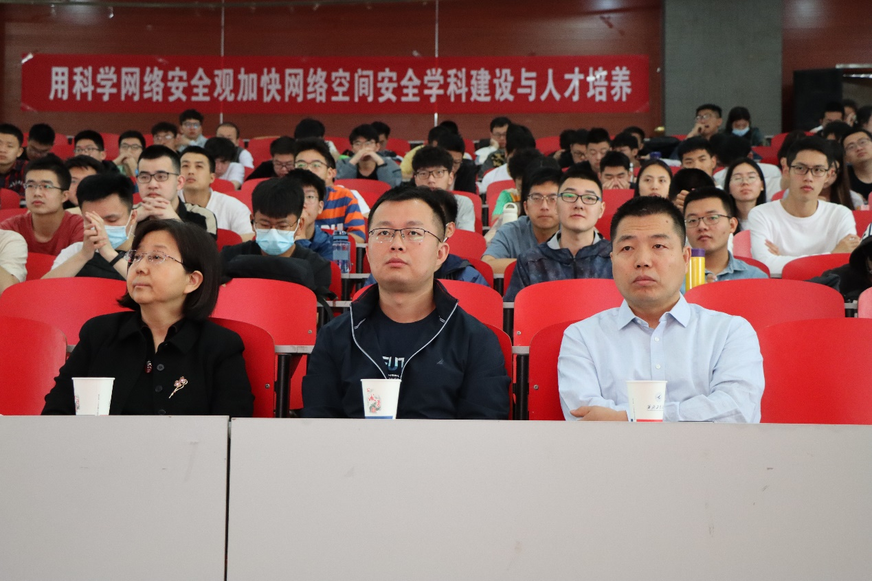紧接着,沈院士就加快推进网络空间安全学科建设和人才培养为师生进行了讲授,从“专业学科形成过程及要求、学科培养目标及方向内容、学科培养目标及方向内容、学科的基础知识体系和能力体系、争创一流推筒子