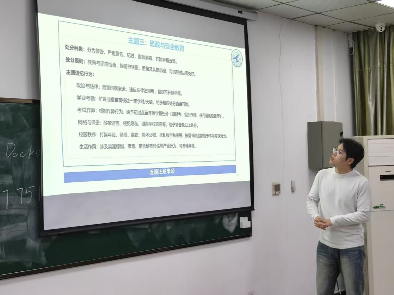 在年级大班会环节,兼职辅导员肖伟宁带领同学们学习了《推筒子
