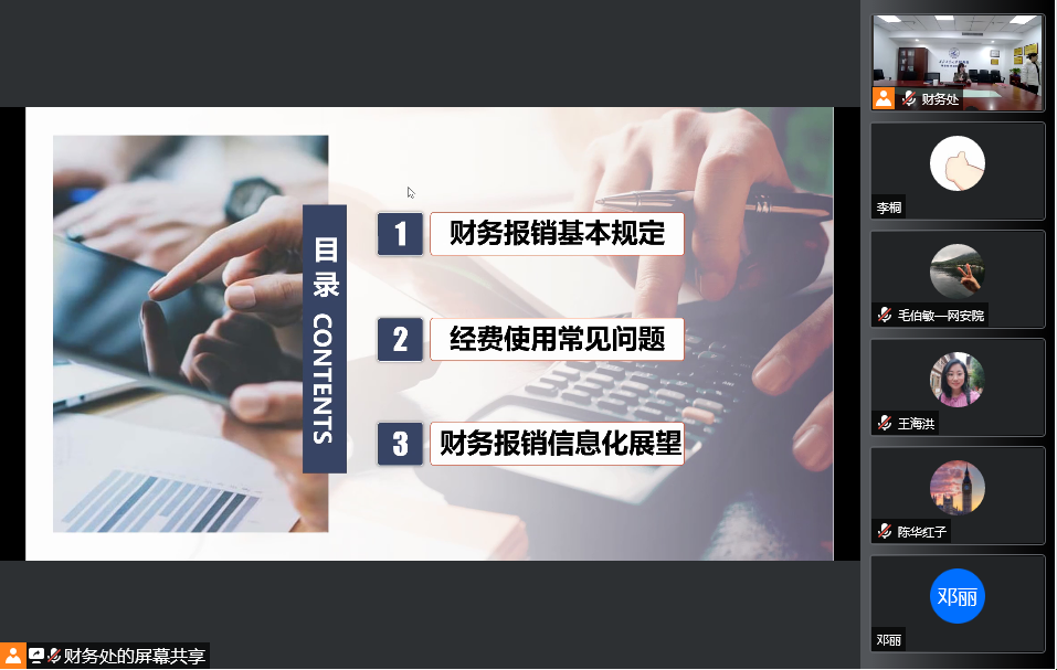 呼瑞雪从用财务报销基本规定、经费使用原则和常见问题案例、财务报销信息化展望三个方面进行了详细的讲解。首先介绍了常用财务制度和报销管理规定,汇总了常见退单原因,强调了各类合同审批与签订注意事项,重点讲解了差旅费报销政策和支付结算规定,提醒报销票据信息的准确、完整性核验。紧接着对经费使用原则和常见问题案例进行了详细的分析,通过虚开发票、超额支出、规避签订合同、串用科研经费、扩大专项资金开支范围等案例讲解,重点强调了各类经费使用真实性、合规性的重要性。最后展示了推筒子
