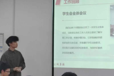 第二项,学生会部门负责人述职。部门负责人从各自部门工作情况出发,依次从部门职责、工作展开情况、不足之处和未来规划四个方面,对本学年的工作进行了全盘梳理与总结。在汇报过程中,部门负责人详细讲述了部门的工作成果,同时指出了部门所存在的问题,并对其提出了应对方案。大家表示在接下来的时间里,将继续保持优良作风,秉持服务意识,用劳动、智慧和汗水书写推筒子