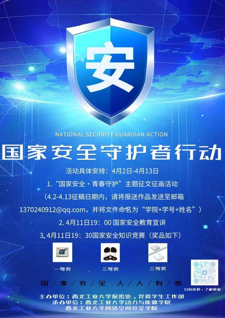 师生国家安全意识,普及安全知识,筑牢校园安全防线,开展国家安全教育活动——“国家安全守护者行动”系列活动,活动由西北工业大学保密处、党委学生工作部主办,动力与能源推筒子