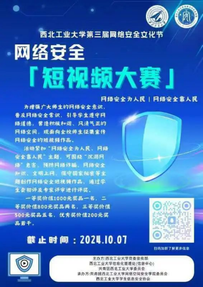 在信息化日益发展的今天,网络安全已成为保障社会秩序和个人隐私的关键领域。为促进网络安全意识的普及,并激发同学们对于这一议题的关注与思考,西北工业大学举办短视频大赛,现面向全校师生征集宣传网络安全的短视频作品。