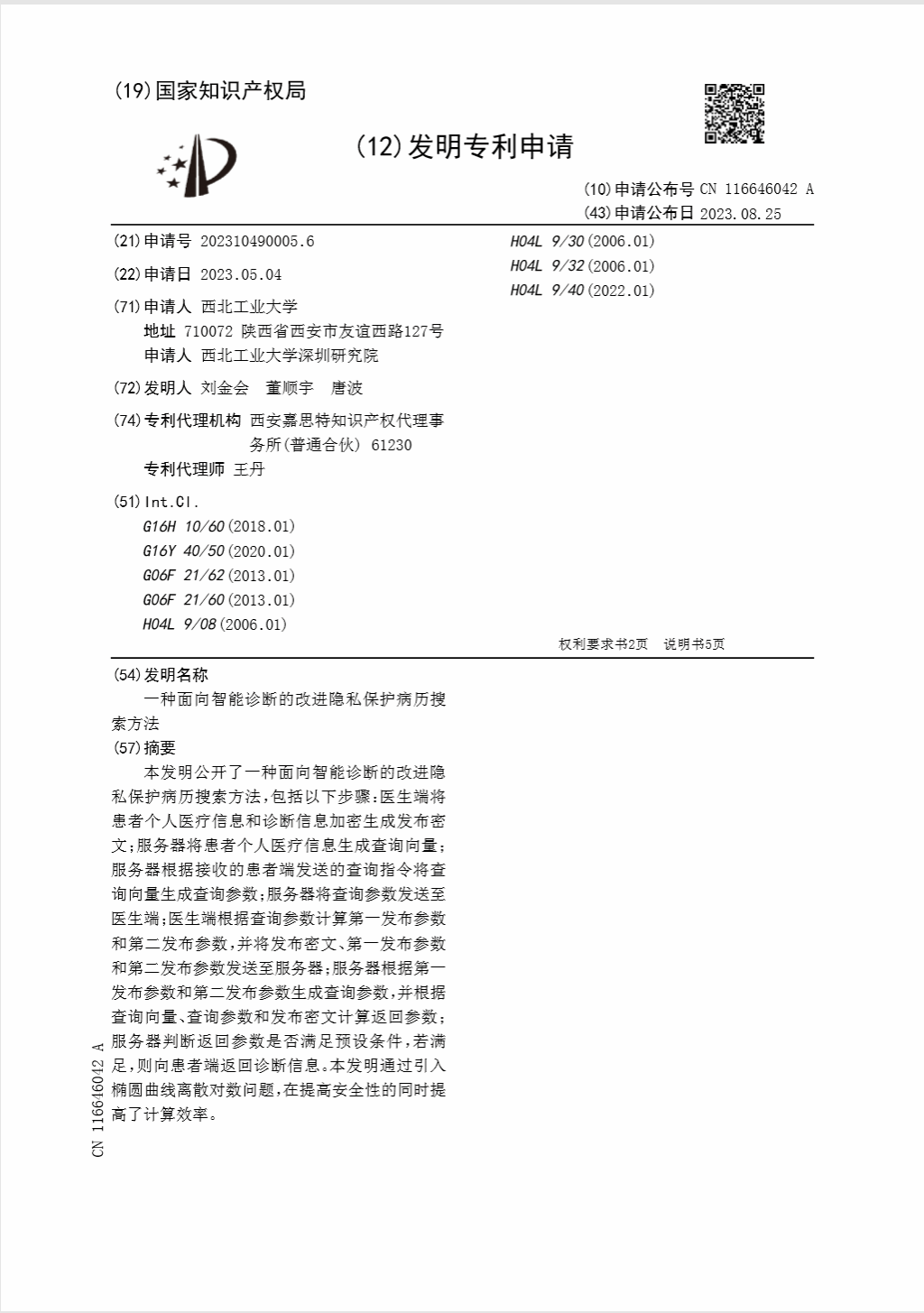 · 发明专利《一种面向智能诊断的改进隐私保护病例搜索方法》,学生一作(已公开)
