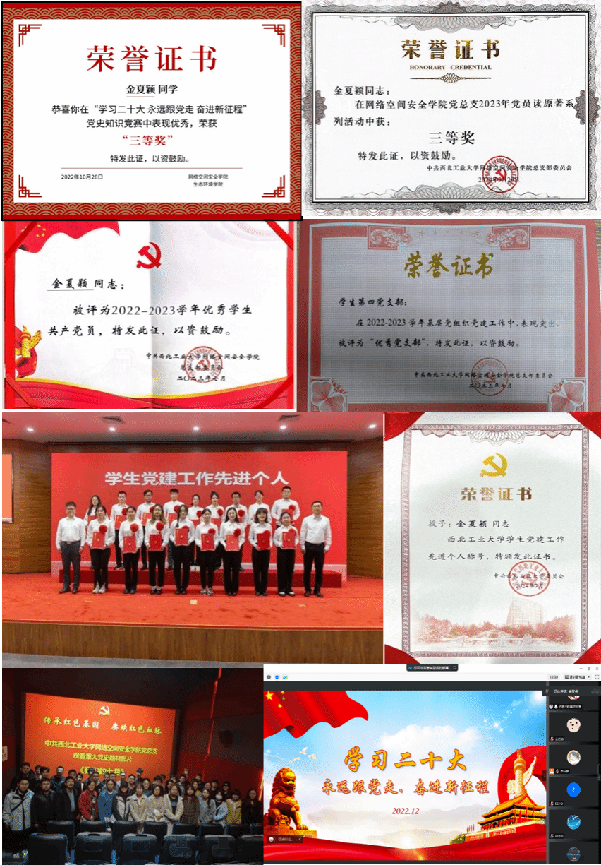 党委的有力引领下,她系统深入学习党的创新理论,将政治理论学习转化为引领行动的精神坐标,并获得“学生党建工作先进个人”、“优秀党员”、“优秀党支部”等荣誉称号。她积极参加迎接建党100周年推筒子