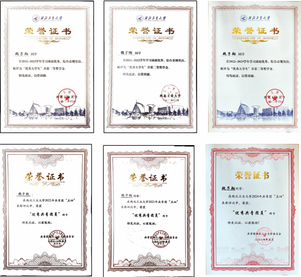 除了在科研与论文方面取得突出成果外,魏子翔同学在本科阶段还积极参加各类学科竞赛,展现出较强的综合实践能力与团队协作精神。2022年-2024年间,参加了两项国家级大学生创新创业项目,均获得良好结题。2023年,作为团队队长参与中国智能车未来挑战赛并获得全国一等奖;