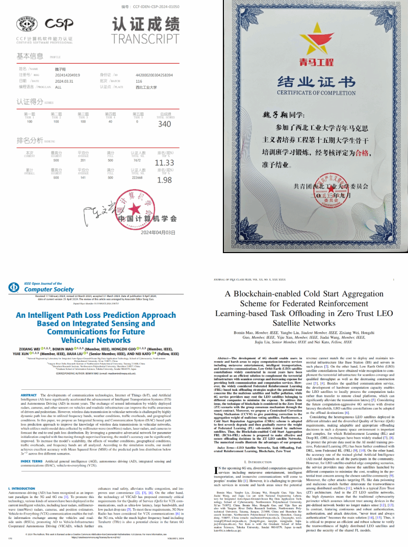 在攻读学士学位期间,魏子翔同学在科研中展现出严谨认真的态度,对知识的积累不仅体现在紧跟计算机前沿技术的发展,更扎根于基础理论与方法的深入理解。在2024年中国计算机学会(CCF)主办的CSP计算机软件能力认证中取得340分,位列全国前1.98%。科研方面,魏子翔同学怀揣对计算机科学的热爱,积极参与课题研究,加入空天地海一体化大数据应用技术国家工程实验室,在毛伯敏教授指导下,围绕边缘缓存、边缘计算、信号处理等方向展开研究,累计参与科研项目六项,其中以第一作者身份发表IEEE Open Journal of the Computer Society (SCI,JCR Q1)论文1篇,以第二作者或学生二作身份发表通信领域顶刊IEEE Journal on Selected Areas in Communications (中科院一区,CCF A)论文1篇、2023 the 15th International Conference on Communication Software and Networks (EI) 会议论文1篇;以第一作者或学生一作身份申请国家发明专利4项,授权软件著作权2项;以其他发明人身份申请三项专利;。此外,魏子翔同学还曾赴清华大学网络科学与网络空间研究院实习,期间产出网安领域顶会论文IEEE Symposium on Security and Privacy论文一篇 (CCF A)。