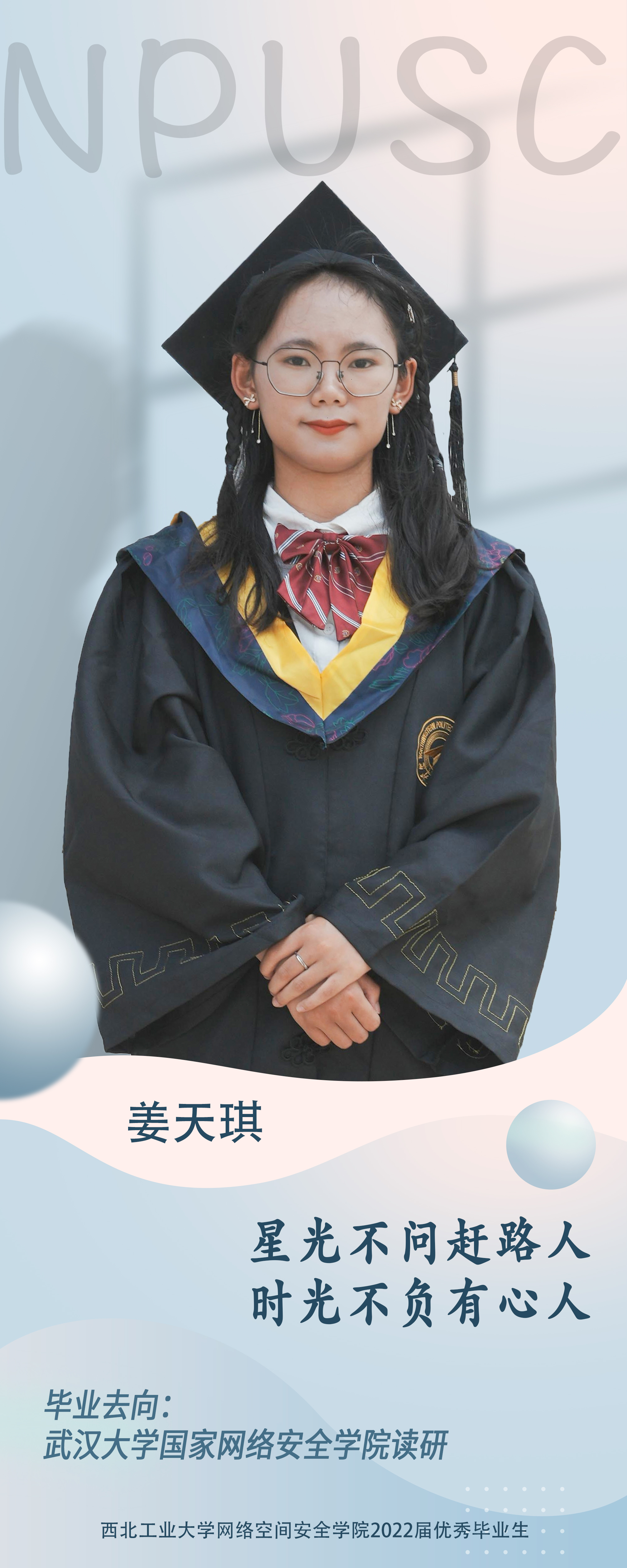 2018级本科生姜天琪。学习上,她态度端正勤奋好学,目标明确学习热情高。在努力做到学好专业知识的同时,还涉猎其他方面的知识,最终也取得了优异的成绩,连续三年获得院优秀奖学金。学习之余,她还爱看各种文学类书籍,想要由此提高自己的思想境界。生活上,她一直保持着“走一步,停下来,思考一番,再继续走,稳扎稳打”的生活态度。乐观向上,踏实务实是大多数人对她的评价。本科期间曾担任学生会副部长。曾获得院优秀学生、推筒子