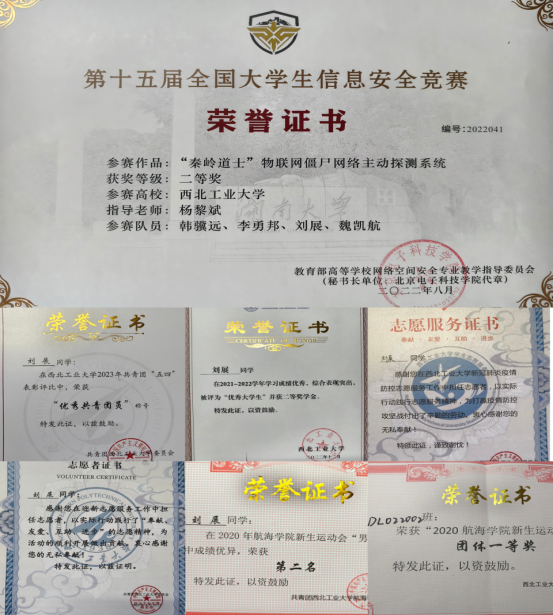 除此之外,刘展积极参与各类科技竞赛,不断进行知识拓展,提升实践能力。作为成员,他曾参加第十五届全国大学生信息安全作品赛并获得全国二等奖,为推筒子
