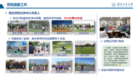 篮球足球小班赛、篮球足球毕业杯,共计大小比赛50余场,对接体育三航杯、新生杯等校级赛事10余项。
