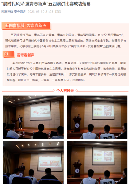 团委持续开展“学党史、强信念、跟党走”主题教育,开展“党员读原著”主题教育专题栏目,党员领着团员学,已发布专栏86期,累计阅读量10000+。紧跟时事热点,举办“五四青年说”主题演讲比赛;以庆祝新中国成立75周年为契机,举办校级主题征文比赛;邀请大学生青年宣讲团开展红色主题教育,把引领广大同学争做“总师型人才”作为做好一切工作的“题眼”,助力网安青年接好历史接力棒,赓续红色基因。五年来,推筒子