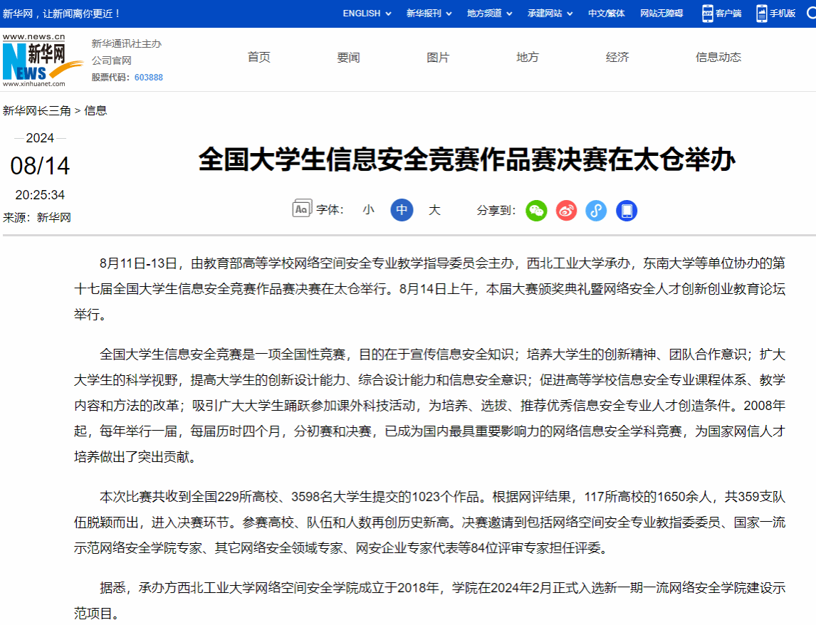 品牌活动-“网络安全文化节”,构建以党建为引领、网络安全实战对抗为核心,融合信创安全竞赛、科普宣教、专家论坛、专题展览、校企合作及网安总师英雄会等多种形式,贯穿短视频大赛、微小说大赛、算法马拉松大赛、保密宣传大赛等校级活动,突破课堂教学及常规实践的局限,提高大学生的网络安全意识与能力,促进网络安全知识的普及。连续三年举办网络安全文化节开幕式,线下覆盖人数达1000+,丰富同学们的校园文化生活。举办“铸剑杯”全国大学生网络安全攻防竞赛,吸引全国近40支知名高校战队参与,获得人民日报、人民网等国家级、省级媒体报道,累计阅读量超15万次。承办全国大学生信息安全竞赛作品赛,吸引全国229所高校、3598名大学生参与,参赛高校、队伍和人数再创历史新高。
