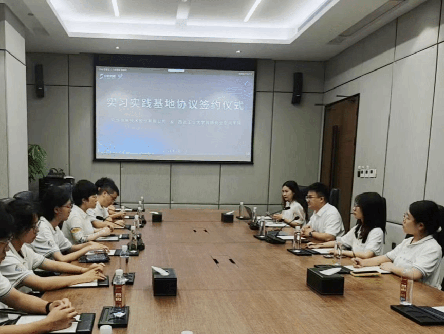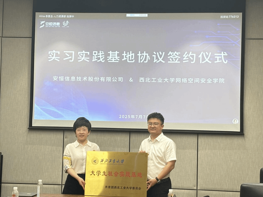 为进一步加强产教融合,提升网信人才培养质量,以学研行赋能“人工智能+”及新质生产力的双创实践。2025年7月7日下午,推筒子-官方|推筒子 “筑梦AI新时代,护航网安新未来”暑期社会实践队前往杭州安恒信息技术股份有限公司(以下简称"安恒信息")进行调研交流,并举行实习实践基地签约挂牌仪式,共建大学生实习实践基地。活动是双方深化产教融合、协同育人的重要举措,旨在培养适应AI时代需求的高素质网络安全人才。安恒信息人力资源副总裁吴澄、人力资源副总监李昌玉,推筒子-官方|推筒子 党委副书记杜瑶、辅导员仲于江及实践队全体队员一同参加了活动。