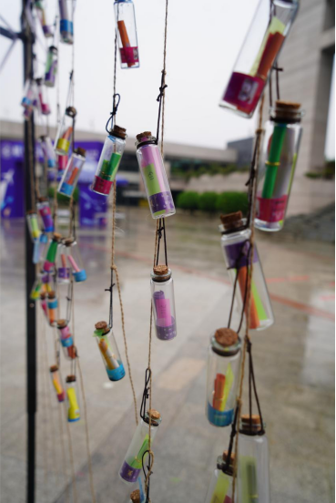 解忧漂流瓶活动中,大家则留下了对于学业、生活等方面的疑惑、问题,希望在同学们中寻找一个答案。大家对漂亮的漂流瓶都十分喜爱,参与活动同学们的漂流瓶变成了一串串风铃悬挂在活动帐篷上,成了翱翔学生中心广场的一道靓丽风景线。