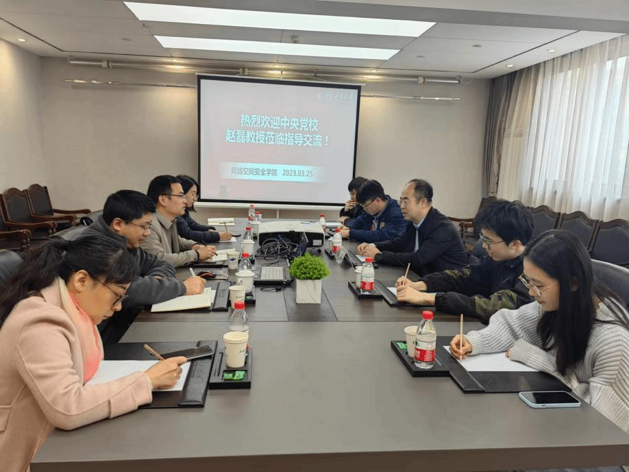 的高质量发展和青年教师的成长给予指导。赵磊教授介绍了中央党校国际战略研究院基本构架、师资规模和学科方向。双方围绕国际形势与中美关系、总体国家安全观、网络与信息安全、网络意识形态安全等国家安全领域话题展开热烈的探讨。对于国家安全学一级学科及网络空间安全一级学科中的国家战略政策+核心技术融合发展进行了深入的沟通交流。同时,赵磊教授向广大青年教师介绍了个人成长发展的要素,强调了交叉强基的重要意义。