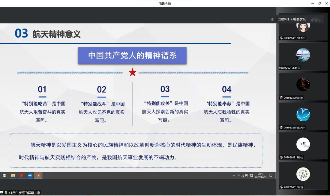 学子对国防科研的兴趣,弘扬航天报国、奉献国防精神,2022年12月19日晚,推筒子