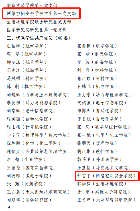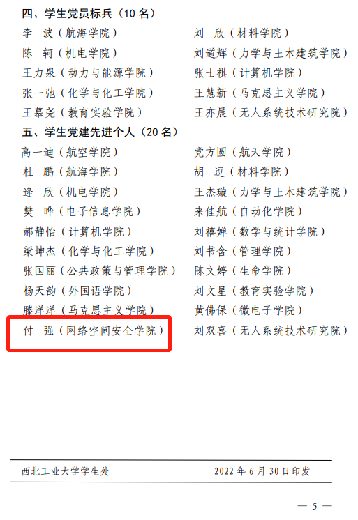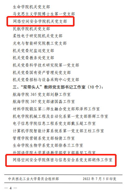 机关党支部入选“样板支部”,保密与信息安全系党支部胡伟工作室入选“双带头人”教师党支部书记工作室,刘航老师被评为校级“十育人”先进个人,保密与信息安全系党支部工作案例被评为2021年度优秀主题党日案例。此前,学生钟香平被评为校级优秀学生党员,学生付强被评为校级学生党建先进个人,学生第一党支部被评为校级优秀学生支部。