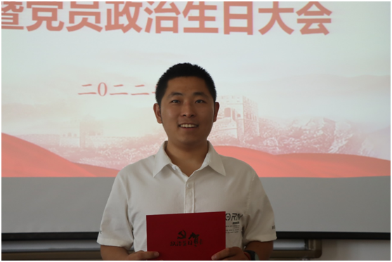 接着是党员集体过“政治生日”环节,与会领导向过政治生日党员赠送“政治生日”贺卡和《请党放心 强国有我》书籍。党员代表王省欣同志从初心是前进的动力、是做事的准则、是担当几个方面追忆入党初心谈感受,并以近几日推筒子