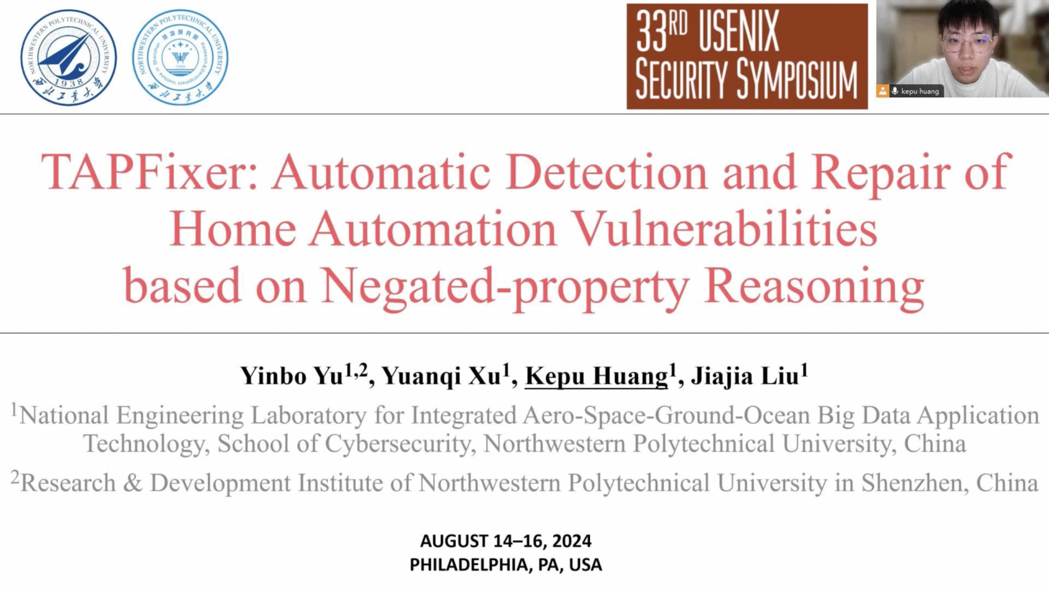 于银菠副教授研究成果“TAPFixer: Automatic Detection and Repair of Home Automation Vulnerabilities based on Negated-property Reasoning”全文被USENIX Security大会正式发表,2023级硕士研究生黄柯蒲作大会报告。该论文是于银菠副教授专注于网络与软件安全领域研究所取得的重要成果之一,也是西北工业大学第一篇作为第一完成单位的四大安全顶会文章。论文第一作者为于银菠副教授,2021级硕士研究生徐源琪和2023级硕士研究生黄柯蒲分别为学生第一作者和第二作者,刘家佳教授参与论文指导。