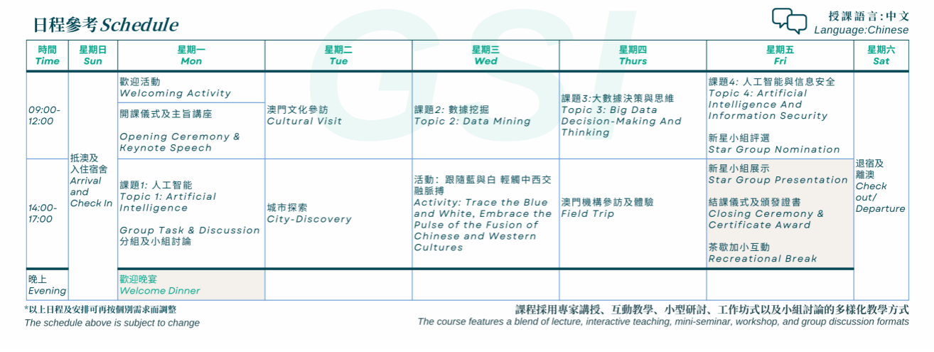 GSI国际暑期班是澳门城市大学提供的交互型学习交流平台,致力于为学习者营造常规课室之外的暑期多层级学习机会,并通过澳门独特的多元文化背景和全球交流的桥梁作用,丰富学员的假期学习模式与渠道。国际暑期班链接内外资源,依托大学品牌,融合十大推筒子 特色,承载教学培育、文化交流和社会服务相结合的传播使命,立足粤港澳大湾区,面向全球,公开招募世界各地为探索学术兴趣、未来学业提升、规划职业方向、探索专业需求的海内外高校大学生、行业从业者、及感兴趣人士等。