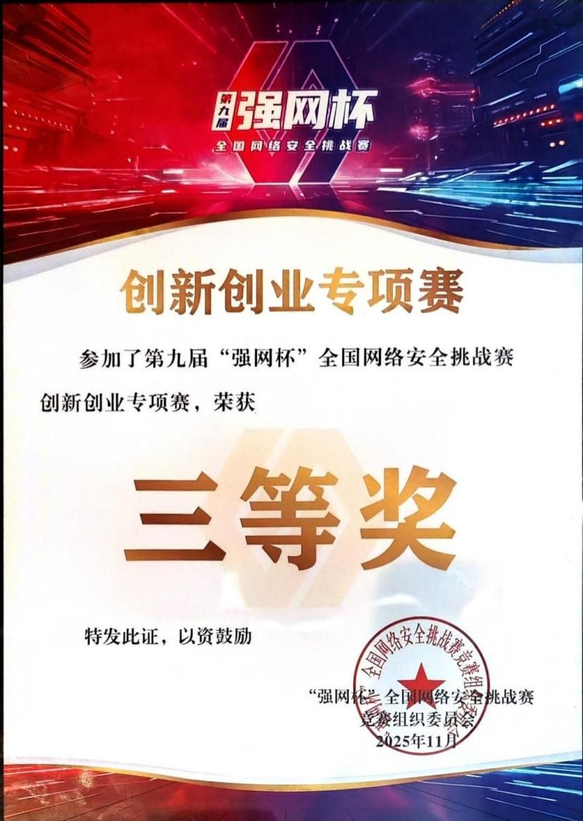 本科生在近期举办的第九届“强网杯”全国网络安全挑战赛创新创业专项赛中奋勇拼搏,凭借扎实的专业功底与出色的团队协作,在全国近两百支高校和企业队伍中脱颖而出,首次晋级总决赛并成功斩获专项赛三等奖!打破推筒子