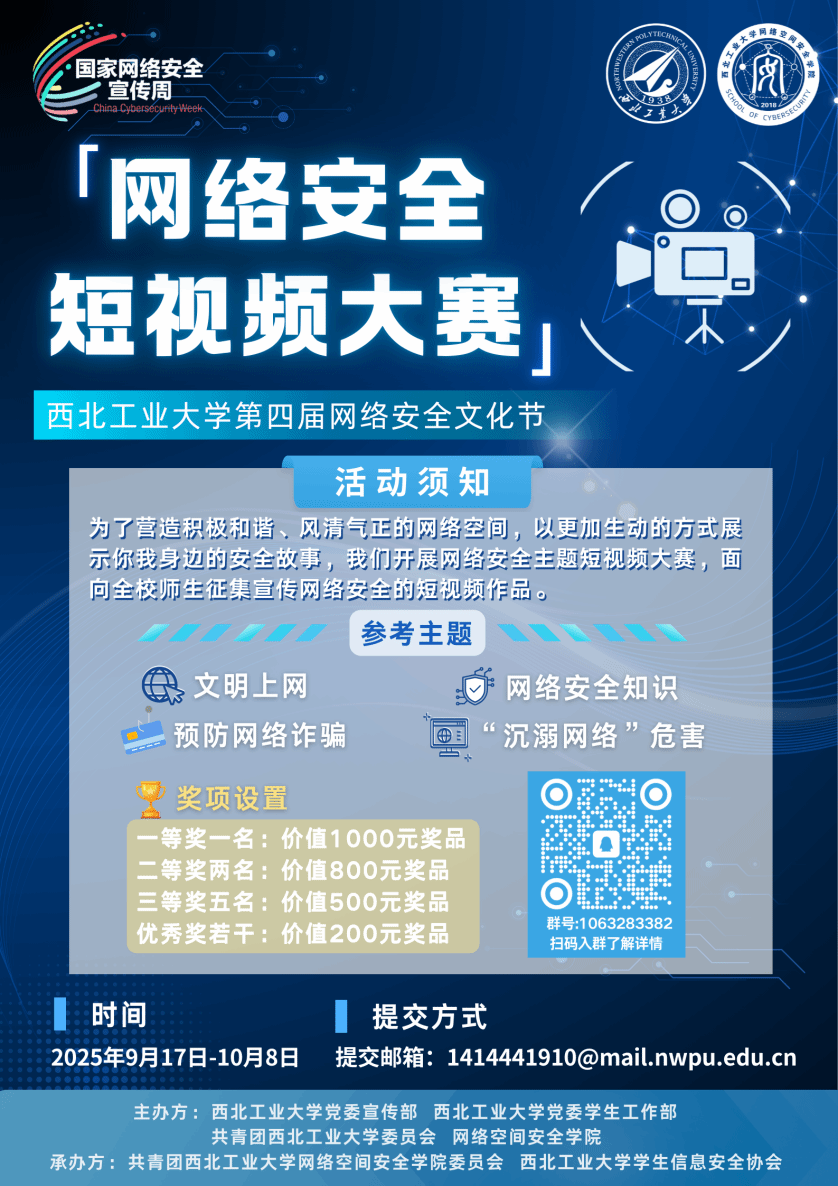 网络安全是新时代经济、社会发展和国家安全的重要保障。为引导全校师生树立“网络安全为人民,网络安全靠人民”的网络安全观,营造积极和谐、风清气正的网络空间,西北工业大学第四届网络安全文化节期间将举办短视频大赛,面向全校师生征集网络安全的短视频作品。