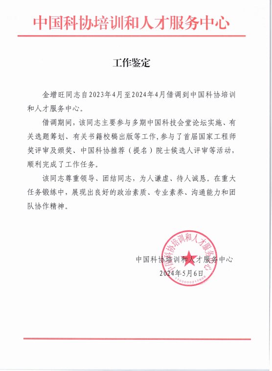 交办的工作任务。在借调中国科协培训和人才服务中心综合处期间,他担任高级项目主管,主要负责多期中国科技会堂论坛的实施、选题筹划、书籍校稿出版等,以及论坛投标、信息化平台等保评审,负责女性科技工作者专委会、高校科协、人事招聘等工作,深度参与首届国家工程师奖评审及颁奖、第三届全国创新争先奖颁奖、中国科协推荐(提名)院士候选人评审等重要活动。他突出的能力和优秀的工作业绩赢得了单位同事的一致好评,得到借调单位领导的高度肯定和评价,中国科协培训和人才服务中心专门发来感谢信,赞扬该同志的出色工作。该同志的工作不仅展现推筒子