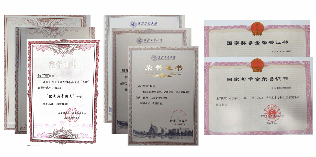2021年9月,翁宇瑄进入西北工业大学信息大类学习。在学习的过程中,翁宇瑄不仅对专业知识有了深入了解,更深刻认识到网络安全人才是国家在数字化时代极为重要的战略资源,对保障国家关键信息基础设施安全、维护国家信息安全和主权、推动数字经济安全发展以及提升国家综合竞争力具有不可替代的作用。夯实专业知识是成长成才的基础,翁宇瑄不断努力学习,从大一上学期成绩排名年级17到前三学年学分绩点3.806,排名年级第4,综合测评总评年级第1,先后获国家奖学金、科为奖学金,连续三年获得校一等奖学金。思想品德方面,作为一名光荣的中共预备党员,翁宇瑄始终在思想上向党组织靠拢。连续三年获得校级优秀共青团员、优秀大学生、学业先进个人等荣誉称号。