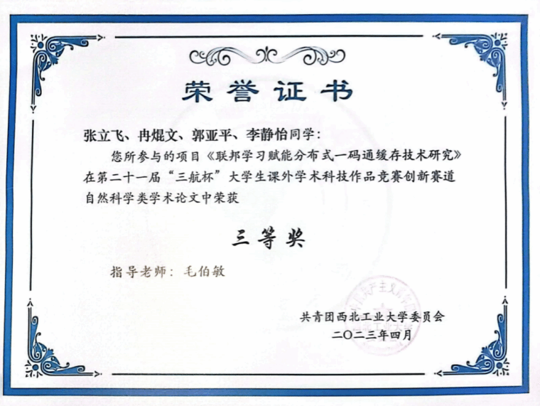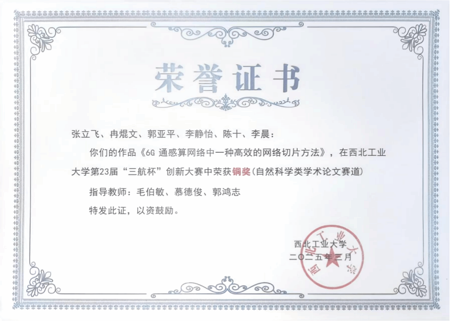 “把知识写进现实,让科研回应生活。”这是张立飞的科研信念。在毛伯敏老师的指导下,他主持国家级大学生创新创业训练计划项目,成功实现良好结题;作为通讯作者兼第二作者发表国际会议论文1篇。他还带领团队连续两年参加西北工业大学“三航杯”系列竞赛,分别于2022年荣获第二十一届“三航杯”大学生课外学术科技作品竞赛三等奖,2024年荣获第二十三届“三航杯”创新大赛铜奖。此外,他以第一申请人身份获得1项国家软件著作权授权,持续以实践检验理论、以创新拓展边界。
